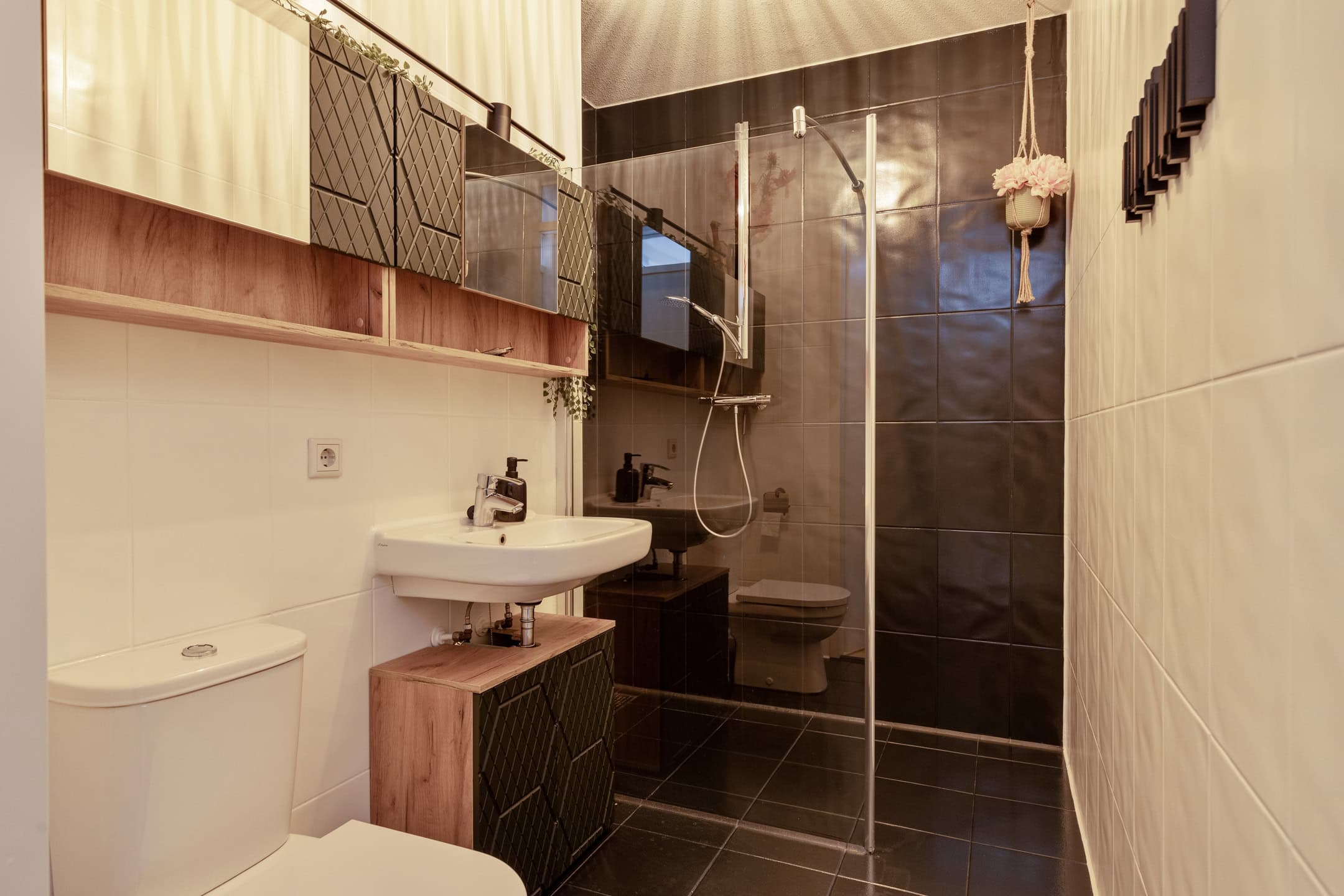 De volledig betegelde, luxe badkamer is compleet ingericht met een inloopdouche, wastafel met wastafelmeubel, bovenkastjes (ter overname) en een toilet.