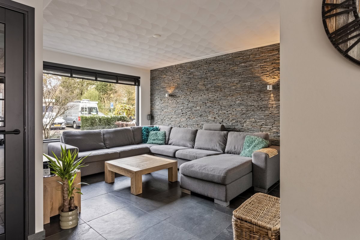 De uitgebouwde woonkamer van maar liefst 45 m² is heerlijk ruim en licht. Voorzien van vloerverwarming, stucwerk wanden, een moderne inbouw gashaard en een grote schuifpui naar de tuin. De halfopen keuken heeft een greeploze L-opstelling met diverse inbouwapparatuur: 5-pits gasfornuis met oven, afzuigkap, koel-/vriescombinatie, combi oven/magnetron, warmhoudlade en vaatwasser. Grenzend aan de keuken is een praktische bijkeuken met toegang tot de tuin.